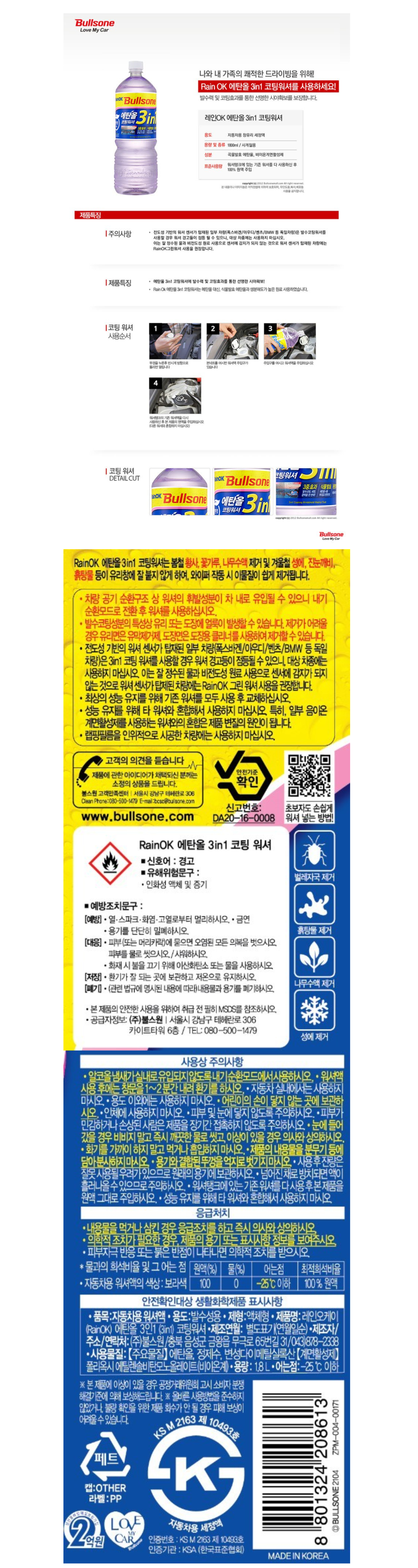 ★불스원★Rain OK 에탄올 3in1 발수코팅 워셔액 1.8L 2개