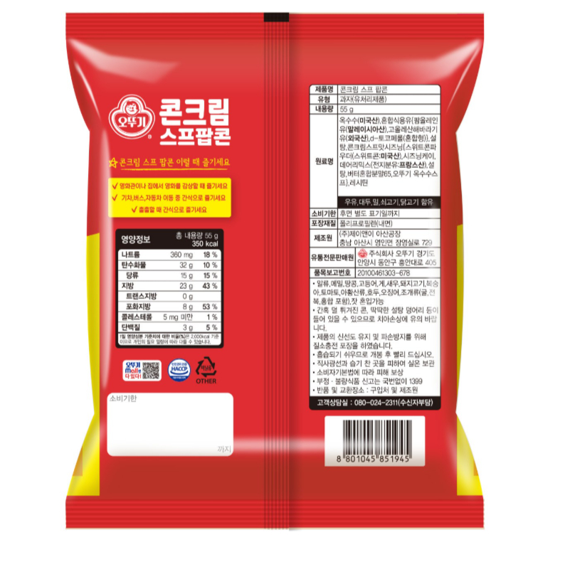 ★오뚜기★ 콘크림 스프팝콘, 55g, 5개
